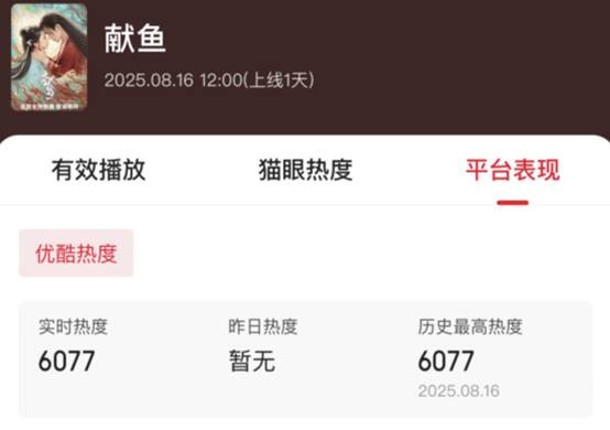 《献鱼》上线优酷,刚播20分钟热度破6000。